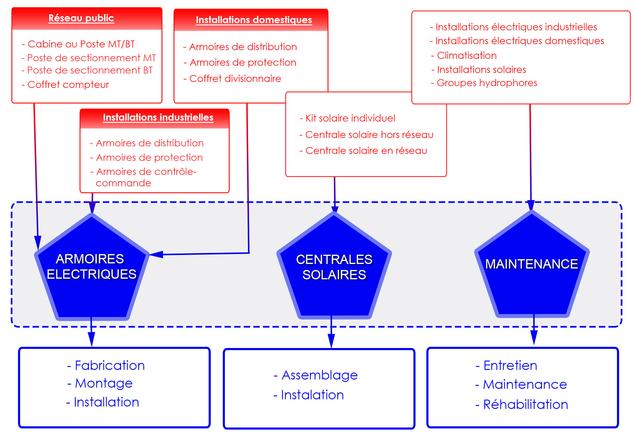 La diversité de nos activités a fait développer notre expertise dans plusieurs métiers qui sont devenus notre spécialité : les cabines de transformation (MT/BT), les centrales solaires, les groupes électrogènes, la climatisation, l’automatisme, la domotique et les armoires électriques